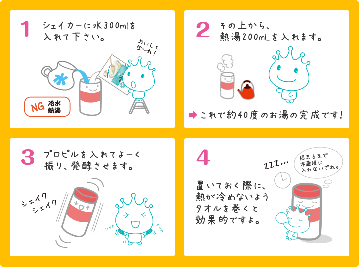 プロピルは粉の状態ですと、菌が眠っている状態です。そこにお湯を加えることで、